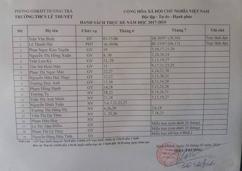 Theo giáo viên Trường THCS Lê Thuyết, lịch trực hè của trường do Hiệu trưởng Trần Văn Bình ký ban hành ngày 24.5. Lịch trực này phân công việc trực hè đối với 20 lãnh đạo, giáo viên, nhân viên nhà trường.