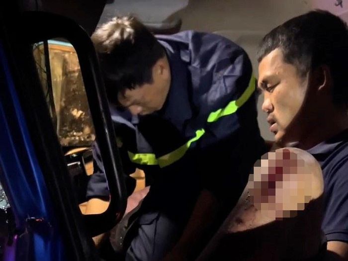 Sau va chạm, tài xế Lê Bùi Anh bị thương, mắc kẹt trong cabin xe.