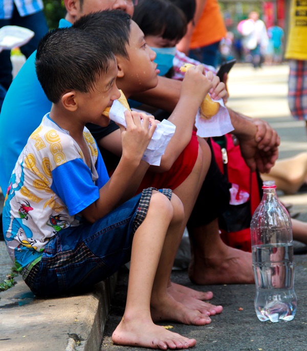 Một em nhỏ ăn ngấu nghiến ổ mì sau khi vui chơi thỏa thích.