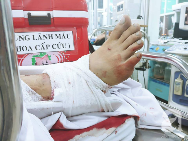 Phan Ngọc Lẹ (quê Sóc Trăng) bị chấn thương đầu, gãy kín hai xương cẳng chân trái.