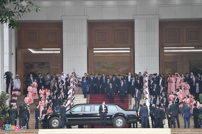 Hơn 11h30, xe chở Thủ tướng Nguyễn Xuân Phúc vào Phủ Chủ tịch. Ngay sau cuộc gặp gỡ với Tổng bí thư, Chủ tịch nước Nguyễn Phú Trọng, ông Trump sẽ hội kiến với Thủ tướng.