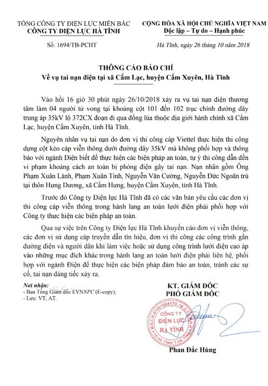 Đêm 26/10, Công ty Điện lực Hà Tĩnh đã phát đi thông cáo vụ 4 người tử nạn dưới đường dây cao thế 35kV tại xã Cẩm Lạc, huyện Cẩm Xuyên, tỉnh Hà Tĩnh.