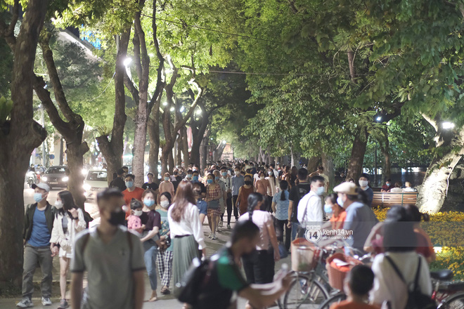 Khu vực xung quanh hồ Gươm tối nay vẫn đông dù cho phố đi bộ đang tạm dừng. Dễ thấy việc người dân đều đeo khẩu trang rất nghiêm ngặt trước những thông tin nhấn mạnh về tinh thần phòng chống dịch.