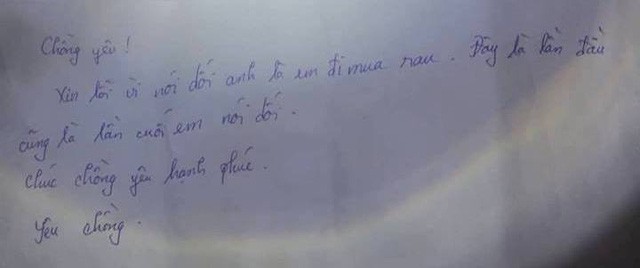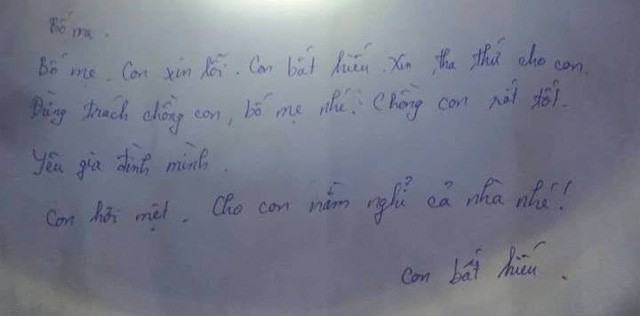 Lá thư của nạn nhân để lại có đoạn: "Bố mẹ, con xin lỗi, con bất hiếu. Xin tha thứ cho con. Đừng trách chồng con, bố mẹ nhé...