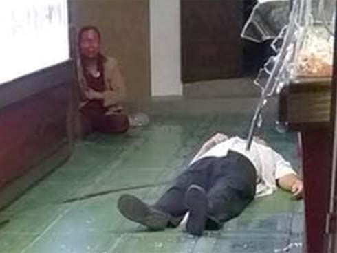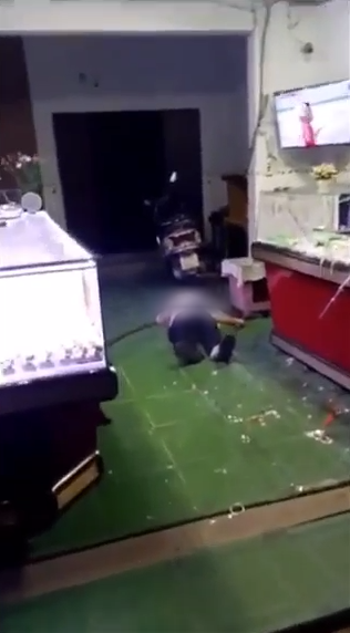 Sau khi bị tấn công, ông Hùng nằm bất động trên nền nhà, còn vợ chủ tiệm vàng cũng bị thương, ngồi cách đó không xa. Hàng xóm đã đưa nạn nhân đi cấp cứu.