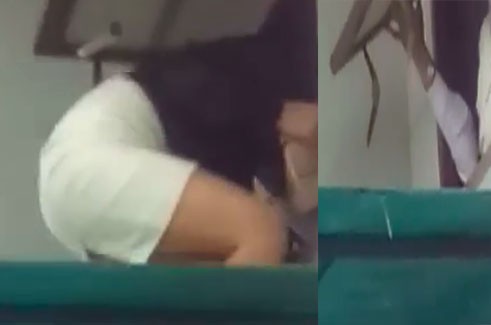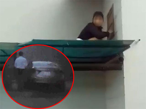 Hình ảnh cho rằng, ông Thuân đỡ cửa thông gió cho bà M. chui vào lại vào trong phòng sau khi bị người quay clip phát hiện (Ảnh báo Giao thông).