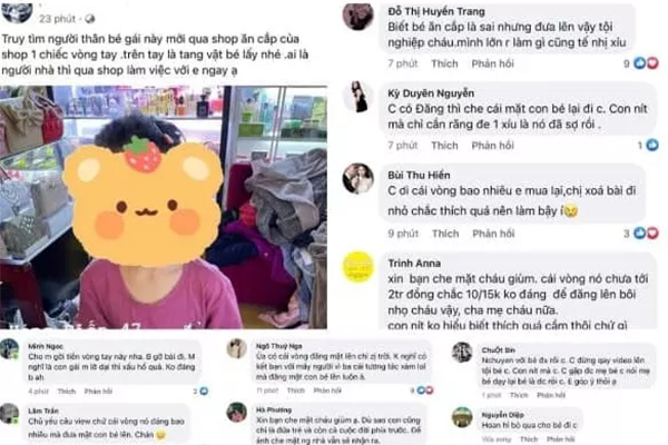 Như Báo Người Lao Động đã phản ánh, mạng xã hội lan truyền 1 bài đăng với nội dung: "Truy tìm người thân bé gái này mới qua shop ăn cắp một chiếc vòng tay. Trên tay là tang vật bé lấy nhé. Ai là người nhà thì qua shop làm việc ngay với em". Kèm theo đó là hình ảnh 1 cô bé được chụp rõ mặt. Ngoài ra, chủ shop còn đăng video cháu bé bật khóc vì lo sợ.