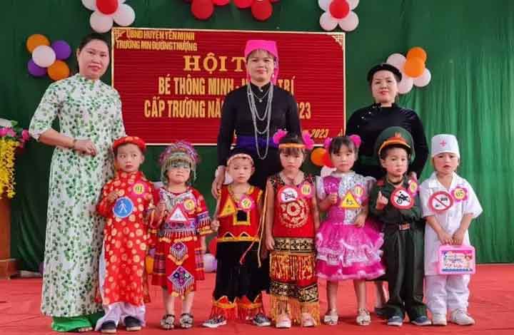 Cô giáo Mai Thị Yến, trường Mầm non Đường Thương (ngoài cùng bên phải) chụp ảnh cùng học sinh trong hội thi bé khoẻ mới đây.