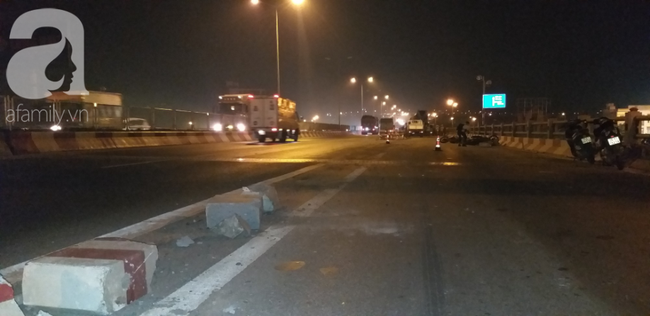 "Lúc đó chúng em đang đi phía sau ở làn xe máy, sau tiếng nổ lốp, lái xe loạng choạng đâm vào dải phân cách. Lập tức những thanh sắt bật ra cùng những cột trụ chắn ngang. Cùng thời điểm, 2 xe máy không kịp phản ứng đã lao trúng, khiến 4 người bị ngã xuống đường", một nhân chứng kể lại.
