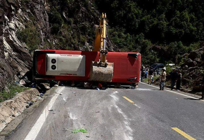 Công an giao thông huyện Khánh Vĩnh cho biết xe khách biển số TP.HCM chạy hướng Đà Lạt về Nha Trang, khi đến Km 56+100, đèo Khánh Lê - đoạn thuộc xã Sơn Thái, thì bị nạn.