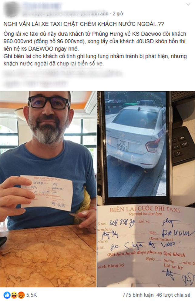 Cụ thể, thông tin đăng tải viết: "Ông nào lái xe taxi dù nhái Thanh Nga này đưa khách từ Phùng Hưng về khách sạn Daewoo đòi khách 960k (đồng hồ 96.000VND) xong lấy của khách 40USD.