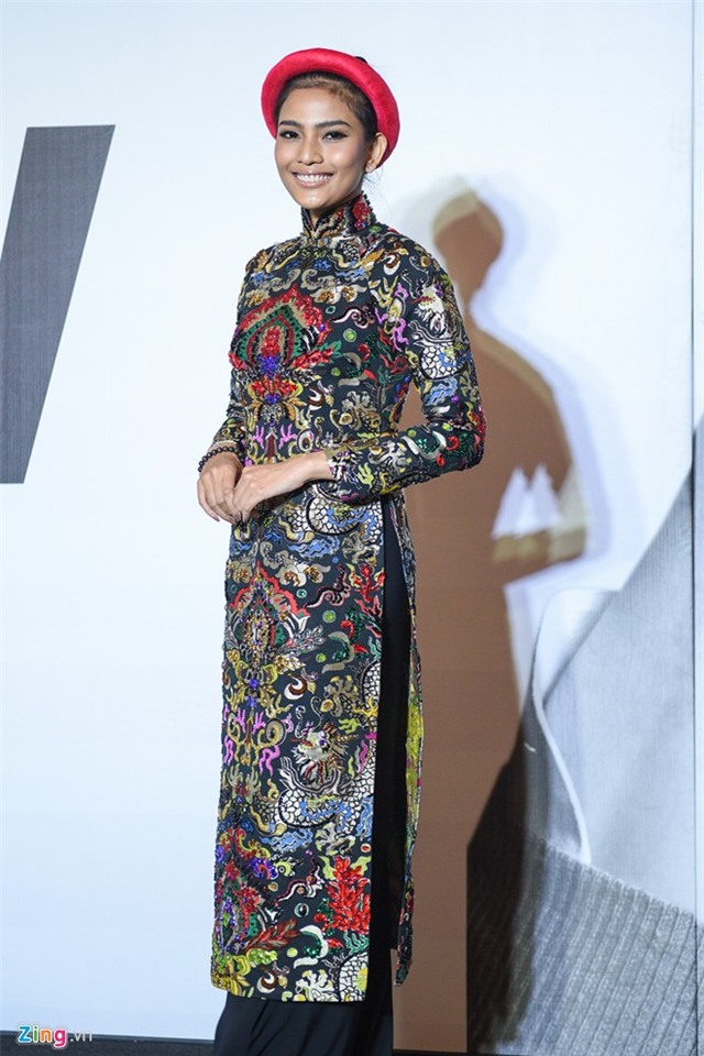| Trương Thị May vẫn giản dị như mọi lần. Cô diện áo dài với hình thêu rồng phượng cầu kỳ. |