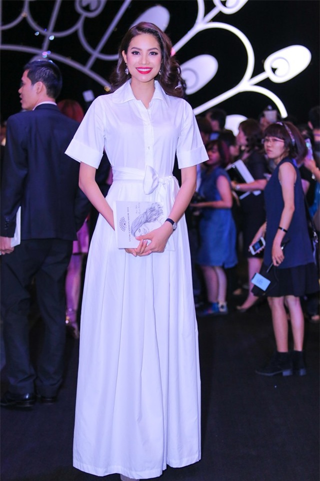 | Hoa hậu Phạm Hương diện đầm kín đáo nhưng vẫn nổi bật nhờ nụ cười rạng ngời. |
