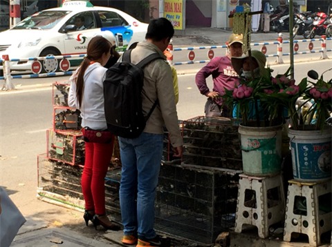 Ngày 22/2, phóng viên VTC News có mặt tại chùa Việt Nam Quốc Tự trên đường 3/2, quận 10, TP.HCM ghi nhận tình trạng các thương lái bày bán chim tràn lan ngoài lòng đường.