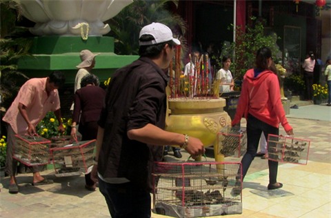 Rất nhiều người dân chọn mua chim đem vào chùa phóng sinh. |