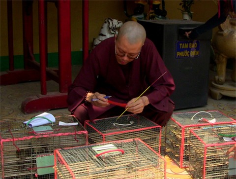 Chim được người dân mua và mang vào chùa chuẩn bị phóng sinh. |