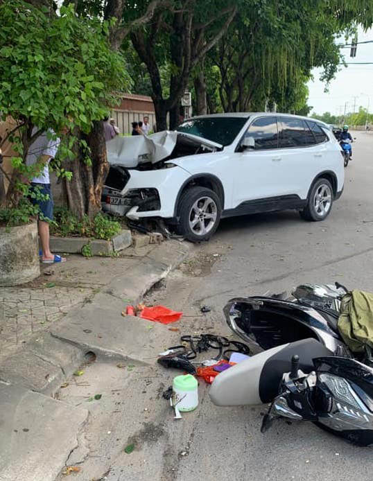Tại hiện trường, 2 túi khí trong xe bung ra. Phía trước xe ô tô bị hư hỏng nặng, nắp capo xe bị bật lên. Riêng chiếc xe máy bị văng ra đường và bị hư hỏng, người điều khiển xe máy bị thương nhẹ.