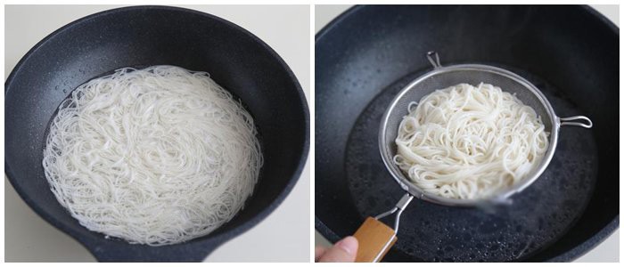 - Sau khi luộc xong, vớt mì ra, cho ngay vào bát nước lạnh để mì nguội.
