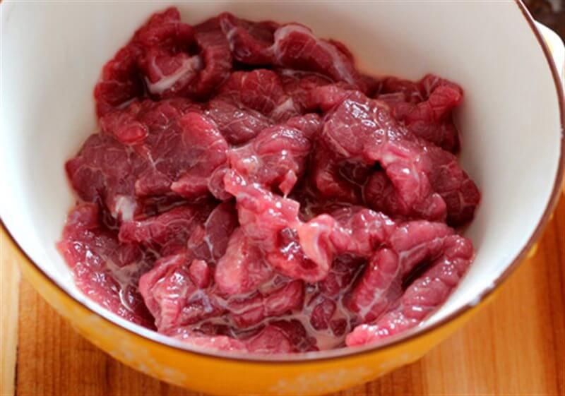 - Sau khi thái mỏng thành các miếng vừa ăn, bạn cũng đừng cho thịt bò vào xào ngay mà bắt đầu đem tẩm ướp. Cho thịt bò đã thái vào bát, thêm baking soda, muối vừa ăn, thêm hạt tiêu và nước tương vào. Sau khi trộn đều tay thì cho một ít nước tinh bột vào, đảo đều, cuối cùng đổ một chút dầu ăn vào, trộn đều rồi ướp lại khoảng 10 phút.