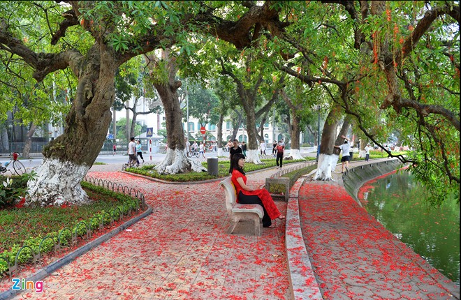 Bên dưới những tán cây lộc vừng, cánh hoa rụng đỏ gốc trông chẳng khác nào những tấm thảm đỏ khiến người đi qua cảm thấy nao lòng.