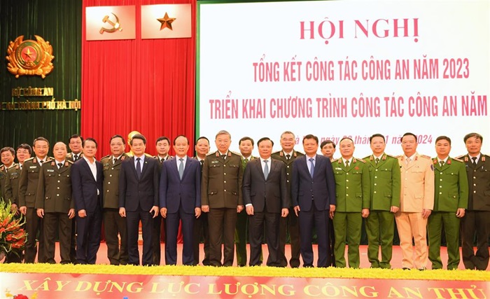 Bộ trưởng Bộ Công an Tô Lâm và Bí thư Thành ủy Hà Nội Đinh Tiến Dũng cùng các đại biểu chụp ảnh lưu niệm