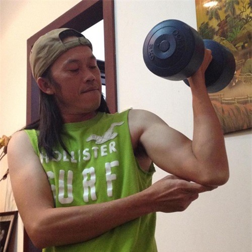 Hoài Linh chia sẻ ảnh tập tạ nâng cơ bắp trong phòng khách.