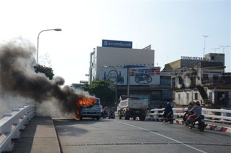 cháy trơ khung. Vụ cháy xảy ra trên cầu nên gây kẹt xe cục bộ.