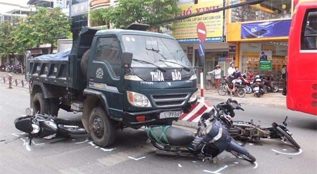 Tài xế xe ben cho biết, khi gần đến ngã tư anh giảm tốc độ cho xe chạy chậm lại nhưng phát hiện xe bị mất thắng, không xử lý kịp nên tông vào 4 xe máy phía trước.
