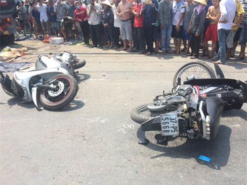 Tại hiện trường, gần chục xe máy nằm la liệt trên đường và hư hỏng nặng.