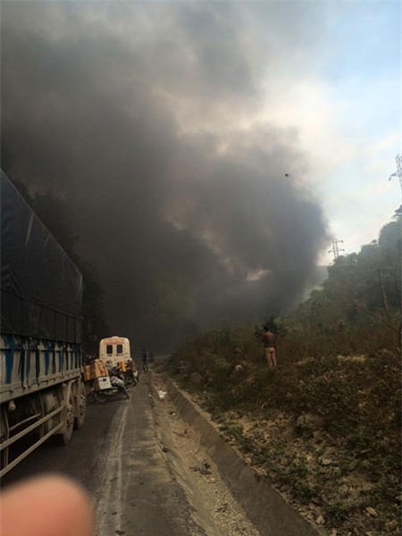ngoài. Cách đó khoảng chục mét, xe bồn hư hỏng nặng phần đầu, bốc cháy,