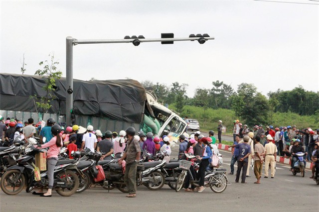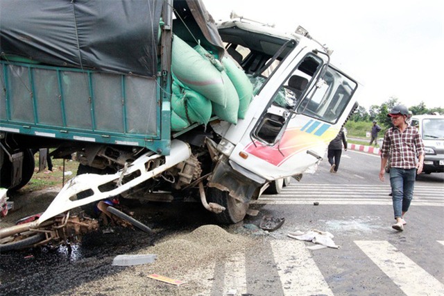 Tại hiện trường, chiếc xe bồn đâm dính chặt vào đuôi xe tải, phần đầu xe biến dạng; nhiều cà phê nhân từ xe tải vương vãi khắp mặt đường nhựa và khiến 1 chiếc xe máy hư hỏng hoàn toàn.