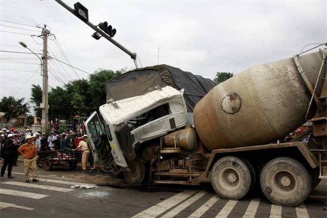 Đang trong thời gian chờ đèn đỏ thì bất ngờ chiếc xe bồn chở bê tông mang BKS 47P-2397 do tài xế Nguyễn Ngọc Dũng (SN 1984, ngụ TP. Buôn Ma Thuột) điều khiển lưu thông cùng chiều phía sau bị mất thẳng nên tông thẳng vào đuôi xe tải.