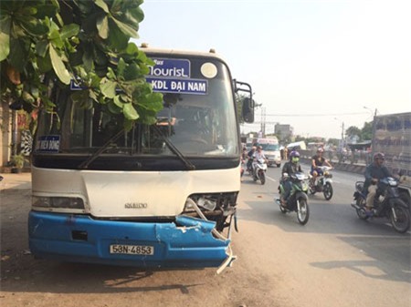 Vụ tai nạn còn khiến chiếc xe buýt bị hư hỏng nhẹ phần đầu, hàng chục hành khách trên xe hốt hoảng.