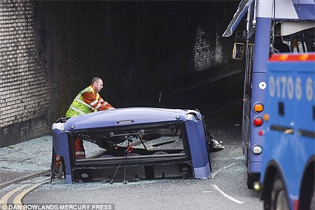 Mái của xe buýt rơi xuống mặt đường trong vụ tai nạn tại Anh hôm 9/9. Ảnh: Mercury Press |