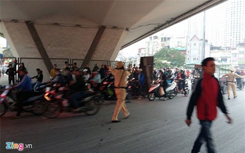Cảnh sát giao thông điều tiết phương tiện khi nhiều người hiếu kỳ dừng lại xem. |