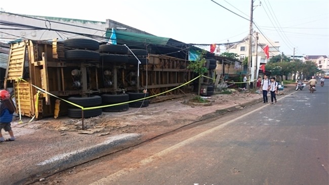 Tại hiện trường, chiếc xe đầu kéo bị lật nghiêng nằm lọt trong phần mái hiên 3 nhà dân. Trong 3 căn nhà bị xe tông sập, tiệm sửa điện thoại di động của ông Nguyễn Hữu Hà bị thiệt hại nặng nhất.