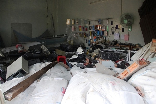 Vụ tai nạn khiến toàn bộ alumin trên xe đổ tràn vào nhà, vùi lấp 1 xe máy và làm nhiều máy vi tính, điện thoại di động bị hư hỏng.