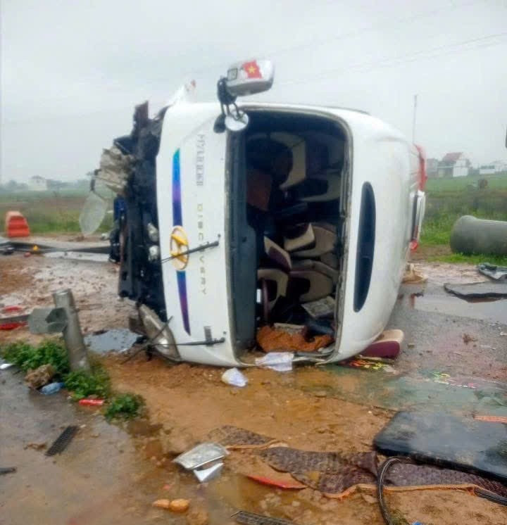 Vụ tai nạn khiến xe 16 chỗ bị lật nghiêng; các em học sinh hoảng loạn kêu cứu. Phát hiện sự việc, người dân đã tới ứng cứu, đưa các nạn nhân tới bệnh viện.