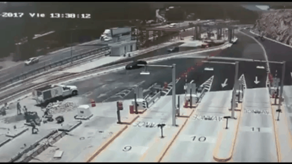 Qua những hình ảnh được camera an ninh ghi lại, có thể thấy chiếc xe tải chở theo các thanh thép dài dường như đã bị mất lái và đâm sầm vào rào chắn của trạm thu phí gần đó.