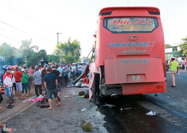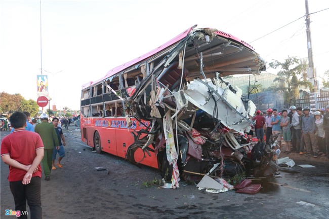 Phần đầu xe khách giường nằm nát vụn sau khi bị ôtô tải đầu kéo đâm trực diện. Hậu quả vụ tai nạn khiến 11 người chết và 33 người bị thương. Hàng chục cảnh sát được huy động đến hiện trường tham gia cứu hộ, cứu nạn.