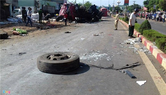 Một bánh xe tải đầu kéo nằm chỏng chơ trên quốc lộ 14 sau khi va chạm với xe khách giường nằm