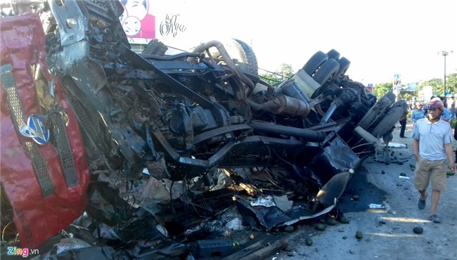 Xe tải đầu kéo trông giống đống phế liệu sau vụ tai nạn. Theo báo cáo nhanh của Tổng cục Đường bộ Việt Nam, xe tải mang biển số 77C-139.37 chạy với tốc độ 105 km/h trước khi đâm vào xe khách trên đường Hùng Vương, thị trấn Chư Sê
