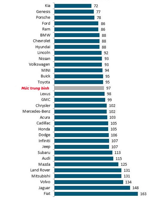 Tính từ dưới lên, tệ nhất là thương hiệu Fiat, với 163 lỗi trên 100 xe; kế đến là Jaguar (148 lỗi) và Volvo (134 lỗi).