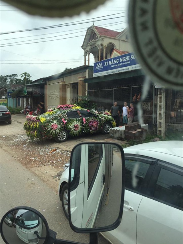 Và chiếc xe dưới đây tại Thanh Chương, Nghệ An cũng không phảilà ngoại lệ và thậm chí còn làm người ta kinh ngạc hơn rất nhiều. Được trang trí bằng rất nhiều hoa, chiếc xe này đã định nghĩachính xác từ "xe hoa".