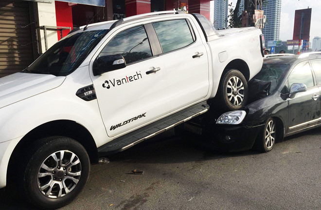Chiếc xe bán tải "ngồi" lên nắp capo ôtô. Ảnh: G.H.