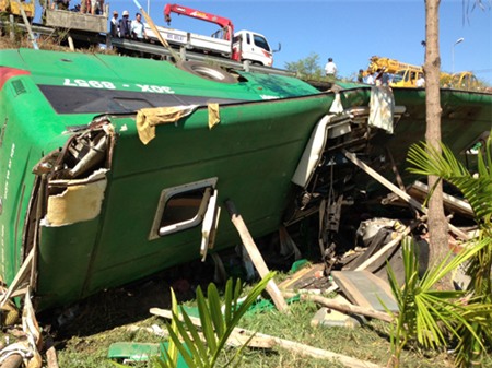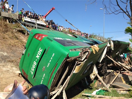 Theo thông tin ban đầu, ngay sau khi tai nạn xảy ra, người dân quanh khu vực đã dùng hàng chục cây đà gỗ của căn nhà đang xây dựng gần đó để chống, dựng nghiêng xe lên và đập các tấm cửa kính còn lại đưa hành khách bị nạn ra ngoài.
