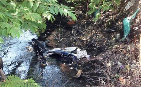 Xe máy của 3 thanh niên nằm dưới mương nước, hư hỏng nặng. Ảnh: T.D. |