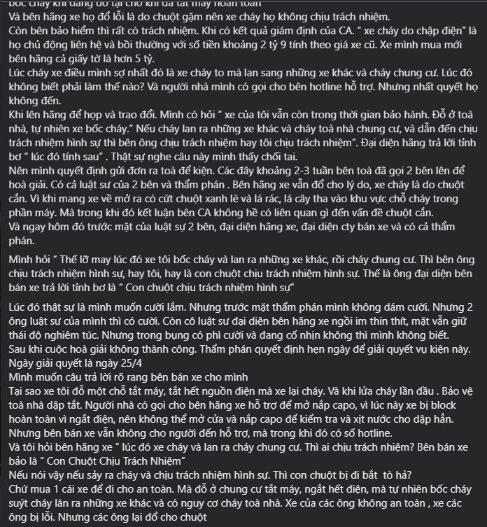 "Phía công an kết luận nguyên nhân cháy là do chập điện. Còn hãng xe thì cho rằng vụ cháy là do chuột cắn dây điện, dựa trên việc phát hiện phân chuột còn tươi và dấu vết gặm nhấm bên trong khoang máy", ca sĩ Duy Mạnh viết.