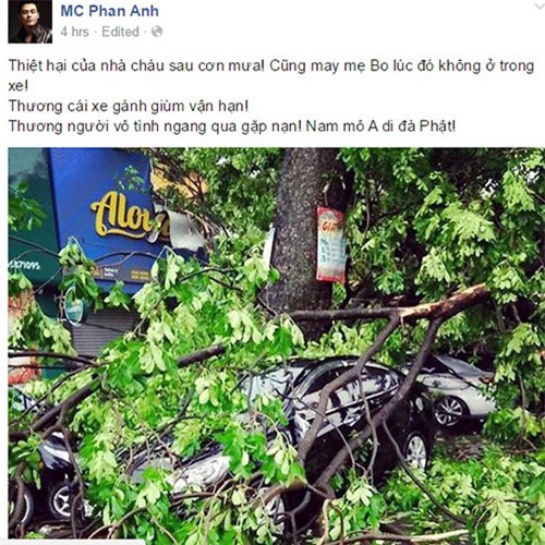 Trên trang cá nhân của mình, MC Phan Anh đăng bức ảnh chiếc xe nhà anh bị cây ngã đè lên và cho biết: "Thiệt