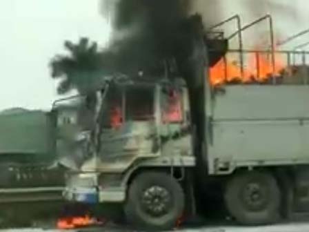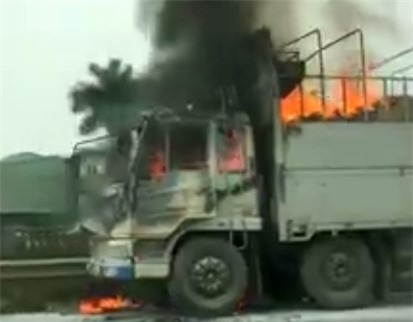 Đầu xe tải mang BKS Lào bốc cháy dữ dội. Ảnh cắt từ clip